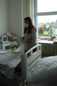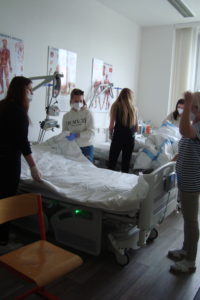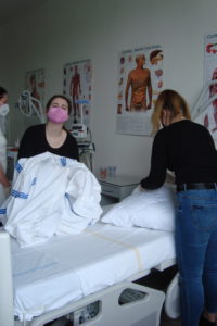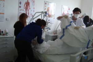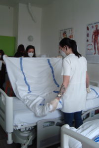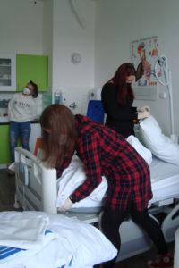 Ve 3. ročníku oboru sociální činnost proběhly na přelomu května a června praktické hodiny pečovatelství. Žáci se pod vedením paní učitelky Mgr. Martiny Pacovské seznámili se standardním a speciálním lůžkem a se zásadami úpravy lůžka. Každý žák si sám vyzkoušel vlastní postup převlékání lůžka a fyzicky náročný výkon úpravy lůžka s klientem.