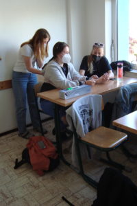 Další praktické hodiny pečovatelství byly věnovány měření fyziologických funkcí. Žáci si měřili tělesnou teplotu, krevní tlak, pulz a dech. Paní učitelka Pacovská přinesla do hodiny různé druhy teploměrů (digitální, bezkontaktní, rtuťový skleněný, …), se kterými si žáci měřili svoji tělesnou teplotu. Pak si vzájemně měřili pulz pohmatem na vřetenní tepně, poslechem pomocí fonendoskopu a také sledovali pulz pomocí monitoru. Na závěr si žáci nacvičili měření krevního tlaku pomocí tonometru a manžety. Jednodušší a rychlejší bylo pro žáky měření krevního tlaku pomocí digitálního tonometru.