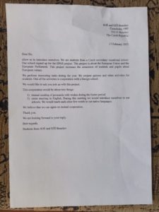 Junior vyslanci napsali dopis s žádostí o vzájemnou spolupráci na francouzské lyceum v městě Charolles v Burgunsku. Rády by si s tamními žáky vyměňovali korespondenci a následně domluvili on-line setkání, při kterém by si vzájemně představili svou zemi a své město. Cílem by byl nejen rozvoj jazykový, ale též poznání Francie.