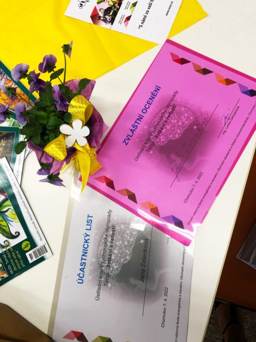 Dne 7. 4. 2022 proběhlo celostátní kolo psychologické olympiády v Chomutově, kam se svou prací z 1. místa postoupila z krajského kola Jana Zelenková (studentka 3. r., oboru praktická sestra) a pokračovala stejně úspěšně. Za její práci a prezentaci jí porota v konkurenci dvanácti prací udělila zvláštní ocenění. Velmi gratulujeme k jejímu výkonu!